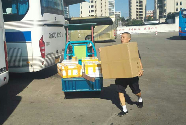 8月8日下午兩點(diǎn),今天的天氣預(yù)報(bào)最高溫度是36℃,可是室外溫度依然高的可怕。東站行李房外,一輛永康班車(chē)迎面駛來(lái),54歲的裝卸工胡瑞華立刻推著手推車(chē)迎了上去。車(chē)停穩(wěn)后,車(chē)上旅客紛紛下車(chē)跑向陰涼處,。對(duì)大部分人來(lái)說(shuō),這種太陽(yáng)下面站著都吃不消更別說(shuō)干活了??墒?,胡瑞華在太陽(yáng)底下一件又一件地卸貨,認(rèn)真干好本職工作沒(méi)有一絲怨言。今天貨有點(diǎn)多,卸了滿滿一車(chē),好在胡瑞華技術(shù)嫻熟,不一會(huì)兒就卸完了,推著車(chē)走進(jìn)行李房。雖說(shuō)只有幾分鐘的功夫,但胡瑞華已是滿頭大汗。車(chē)推進(jìn)行李房后,他對(duì)著電扇吹了幾下又接著開(kāi)始安檢理貨入庫(kù)的工作了。