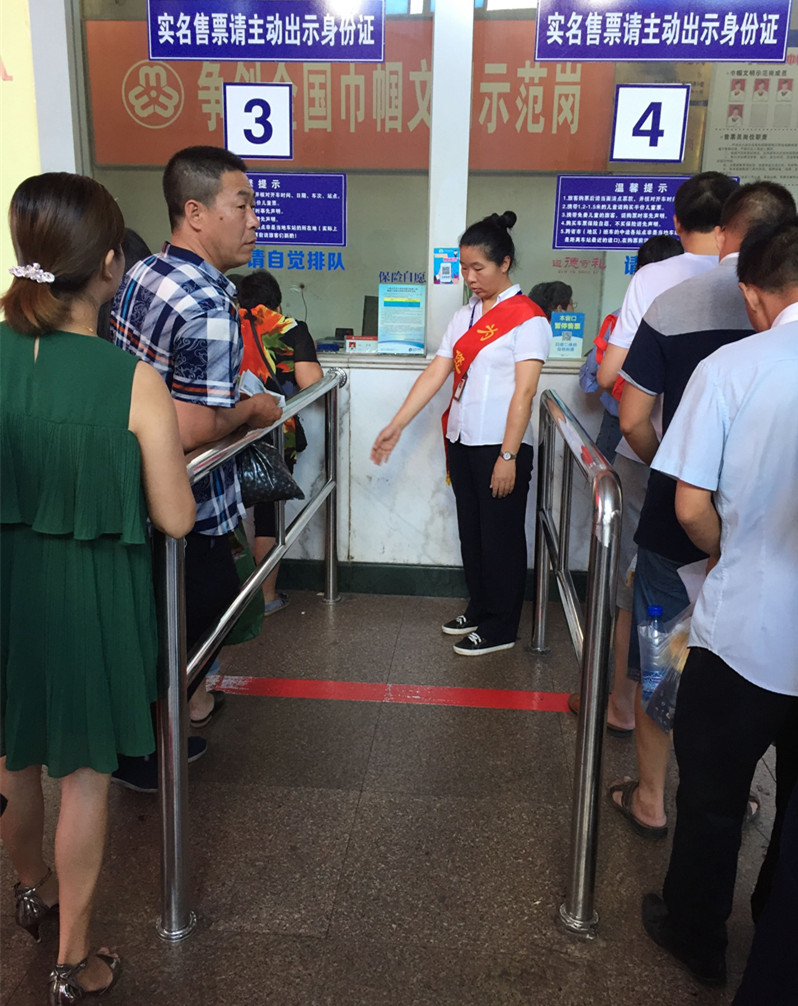 “您好!請不要越過紅線,請站在一米線后等待,”售票廳里尤麗娟正耐心地對正在排隊買票的旅客進行勸導(dǎo)。