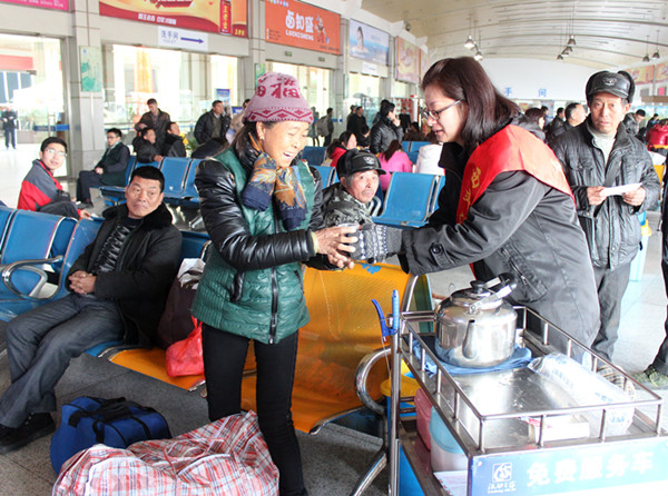 服務(wù)班的陳燕早早的推著服務(wù)車(chē)在候車(chē)室服務(wù),為春運(yùn)第一天踏上回家旅途的人們免費(fèi)送上一杯杯熱氣騰騰的開(kāi)水。陳燕說(shuō),為旅客服務(wù)是她的本職工作,農(nóng)民工兄弟們?cè)谕夤ぷ髁艘荒瓴呕匾惶思?,她和姐妹們要盡自己所能,為他們提供最優(yōu)質(zhì)的服務(wù)。服務(wù)班已備好了生姜茶,隨著氣溫的下降,姐妹們將會(huì)推車(chē)送姜茶服務(wù),為他們回家的途中送上一抹溫暖。