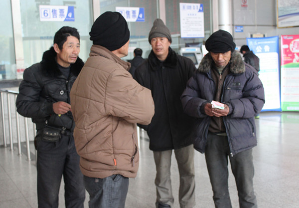 早上8:30,老吳和他的工友們?cè)缭绲氖帐昂眯欣睿轿髡举I(mǎi)好下午1:25去泰順的車(chē)票,這會(huì)兒拿到票,哥兒幾個(gè)才安心的準(zhǔn)備去吃早飯。他們按捺不住心中的喜悅說(shuō):“在外辛苦了一年能在春運(yùn)第一天順利買(mǎi)到車(chē)票回家過(guò)年,很開(kāi)心!”