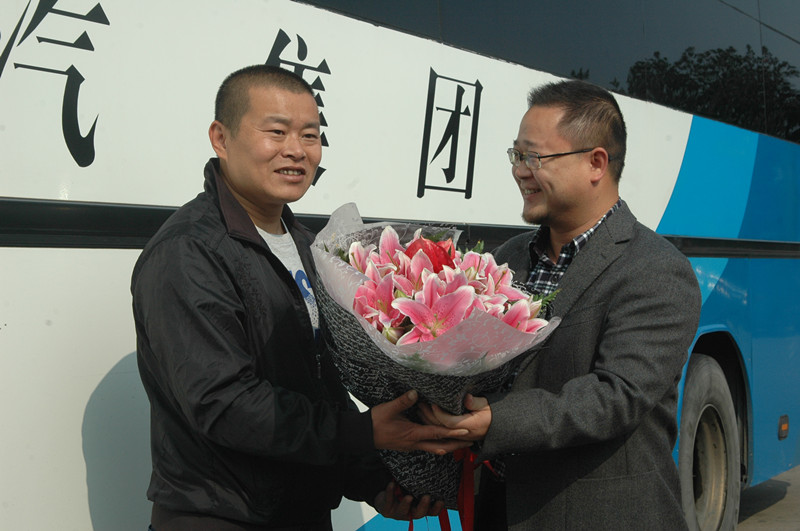 11月4日上午一上班,麗汽集團董事長、黨委書記葉茂和工會主席呂麗君就專程來到客長運分公司,看望慰問章雙林師傅。董事長葉茂親自給章雙林師傅遞上鮮花,贊許這位“最美司機”,稱他是麗汽集團1500多名員工學(xué)習(xí)的榜樣。