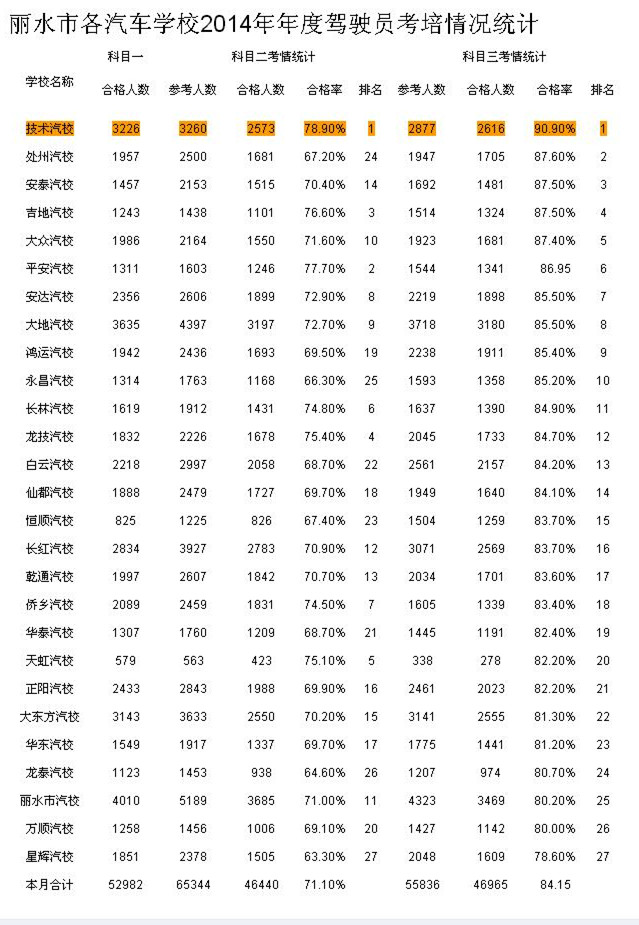 另據(jù)“麗水市各汽車學(xué)校2014年年度駕駛員考培情況統(tǒng)計(jì)”數(shù)據(jù)顯示,麗汽集團(tuán)汽校2014年年度駕駛員考培科目二、科目三的考試合格率分別達(dá)到78.90%和90.90%,兩項(xiàng)排名均居全市第一。