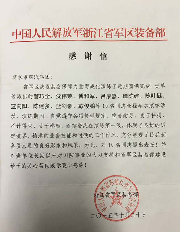 11月19日,麗汽集團收到浙江省軍區(qū)裝備部的一封感謝信。信中對來自快客、伊翔、長運、甌龍等公司的修理工予以了表揚,充分肯定了麗汽員工在參加省軍區(qū)裝備部組織的戰(zhàn)役裝備保障力量野戰(zhàn)化演練中的優(yōu)異表現(xiàn)。