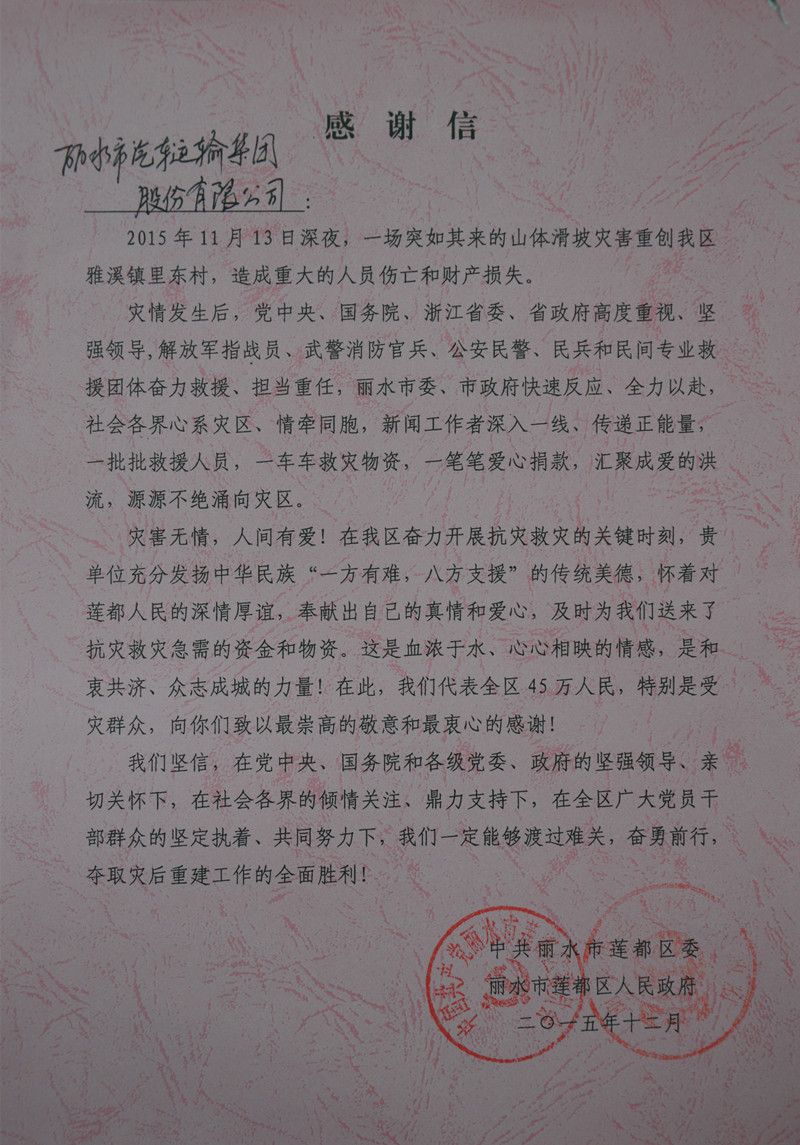 12月14日,集團公司收到蓮都區(qū)委區(qū)政府送來的感謝信,感謝集團公司在里東災區(qū)救援工作中的奉獻。