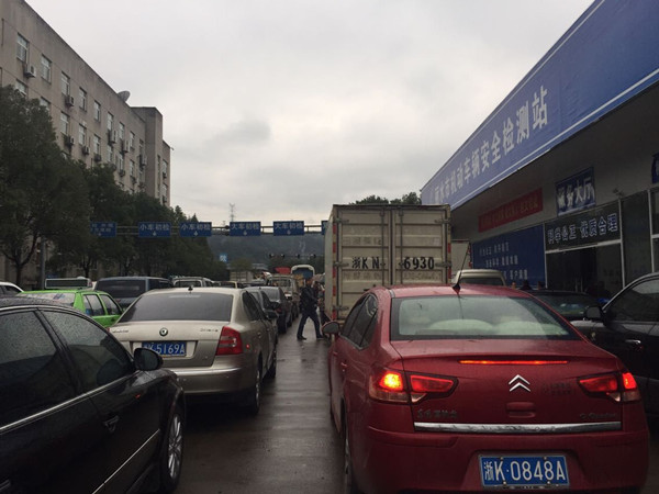 “車子都排到馬路上啦,又是緊張忙碌的一天??!”面對(duì)排成長(zhǎng)龍的待檢汽車,一大早就上班的安檢站員工陳永軍暗暗的給自己打氣。